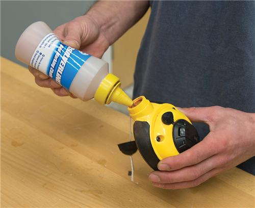 3:1 gear ratio for fast line retraction. Self-chalking line with metal claw. 80mm long plastic line level. Soft-grip plastic body with fold-away winding handle and screw-top filler cap.