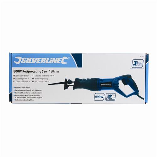 Versatile reciprocating saw with powerful 800W motor. Variable speed trigger and lock-on button. Quick, tool-free blade change mechanism. Rotary handle with 3 preset positions. Rubber over-moulded, vibration-reducing grips provides additional control and comfort while operating. Adjustable shoe for stable guiding of the tool. Max cutting capacity in wood 180mm, steel 10mm. No load speed 0-2800min-1. Includes wood-cutting blade.