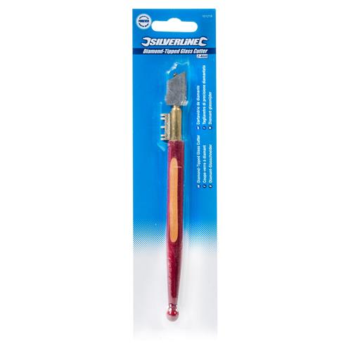 Diamond mounted on durable chrome-plated head. Includes 2 x brass snap-off vices. Smooth, contoured handle for comfort and flat thumb rest for improved control. Cuts glass 2-8mm thick. Overall length 175mm.