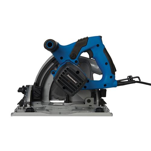 Plunge track saw features a cast aluminium base, blade guards and dust port. 165 x 20mm blade with 24T tungsten carbide teeth cuts natural and composite woods. 2 x 700mm extruded tracks slot easily together from their compact state to create a 1400mm track with a non-slip base. Easily accessible shaft lock aids fast, convenient blade change. Plunge lock for safety enhancement. Soft-grip handles. Includes guide track system for smooth, precise straight and bevel cutting. Bevel range: 0 – 45°. Max. cutting depth: 56mm. No load speed: 5200min-1.