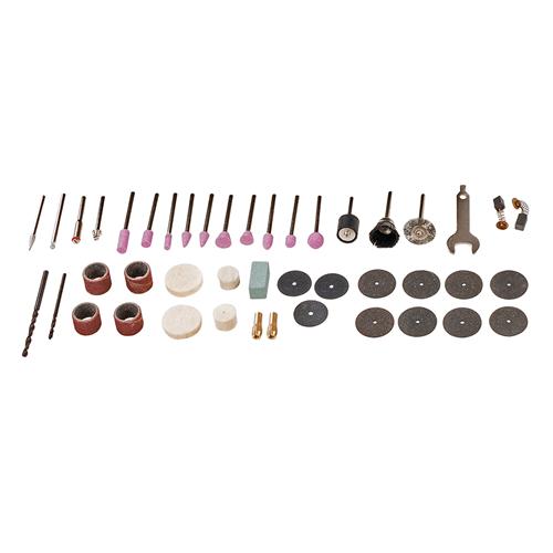 Multi-function rotary tool with accessories for detailed cutting, grinding, polishing, and carving. Variable speed control and spindle lock. 2 x collets provided for mandrels 2.4mm and 3.2mm. Suspension loop. No load speed 8000-32,500rpm. Includes 43pce accessory kit of sanding drums and discs, grinding stones, diamond bits, polishing wheels, and sturdy moulded case.