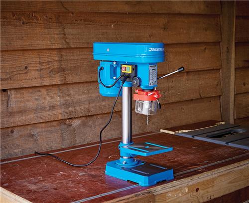 5-speed belt drive. Chuck/spindle travel 0-50mm with gauge for accurate drilling. Strong cast base and machine table. 13mm keyed chuck capacity.