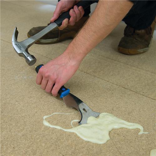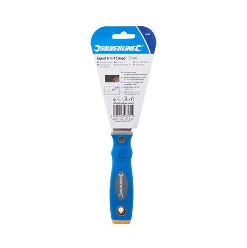 Multifunction decorating tool with corrosion-resistant spring-tempered steel blade. Includes 45° and 90° scraper blades, filling/smoothing knife, nail lever, rounded blade to clean paint rollers. Metal hammer end cap for sinking protruding nails. Hanging hole.