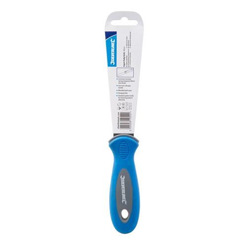 Corrosion-resistant spring-tempered steel blade. Two-tone soft-grip handle with moulded palm grip. Standard pattern knife for removing putty and adhesives. Hanging hole.