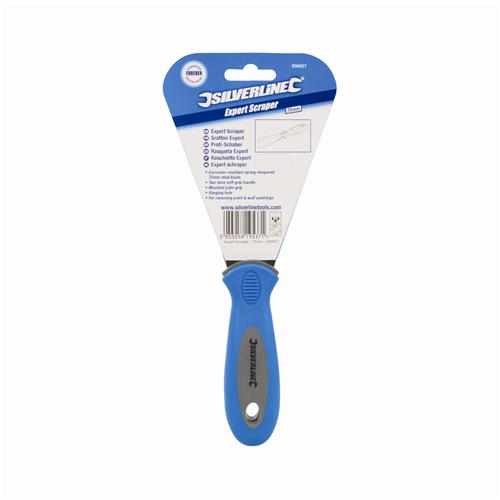Corrosion-resistant spring-tempered steel blade. Two-tone soft-grip handle with moulded palm grip. For removing paint and wall coverings. Hanging hole.