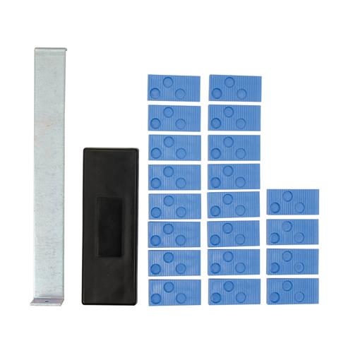 Hardwearing steel pulling bar for creating tight joints in restricted areas, and tapping block to distribute force and pressure over flooring edge. Tapered fitting wedges aid with alignment and creation of expansion gaps. Ideal for installing laminate and solid wood flooring. Includes pulling iron, tapping block and 20 fitting wedges.