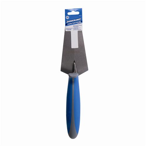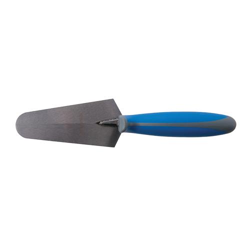 Hardened and tempered carbon steel blade. Comfortable, soft-grip handle for prolonged use. Taper-ground from heel to toe for flexibility. Finger guard, thumb support and high lift for good knuckle clearance. For general cement applications including brick laying, paving and roofing.