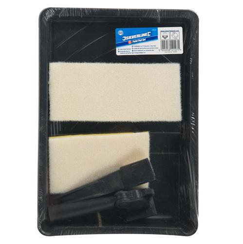 Fleece paint pads with durable polypropylene handles and tray. Ideal for use with oil and water-based paints. Sponge layer allows excellent paint loading whilst top sponge delivers smooth, even paint distribution. Includes 1 x small fixed pad, 2 x large pad heads, 1 x click-fit handle and 1 x paint tray.