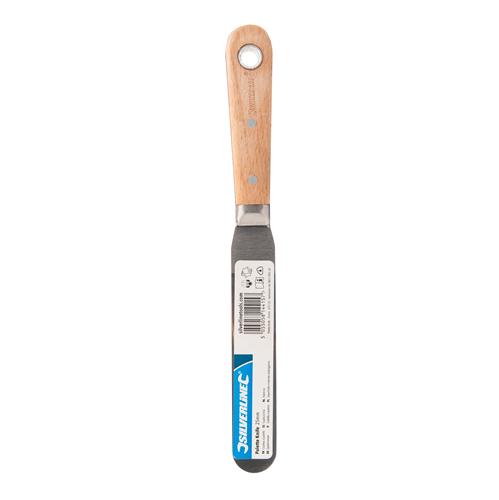 Spring-tempered steel blade. Pinned hardwood handle. For mixing and folding paints, pigments and epoxy resins. Hanging hole.